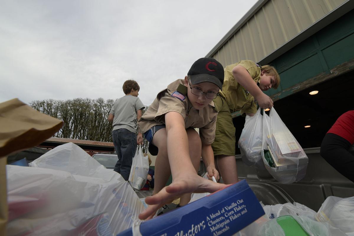 From left, Troop 362 Scouts Kaleb Smith and Ryan Steward unload donated food from a truck Saturday during the Community Holiday Food Drive at the Benton County Fairgrounds. Boy Scouts and community members helped pack donated food for families in need this Thanksgiving.
